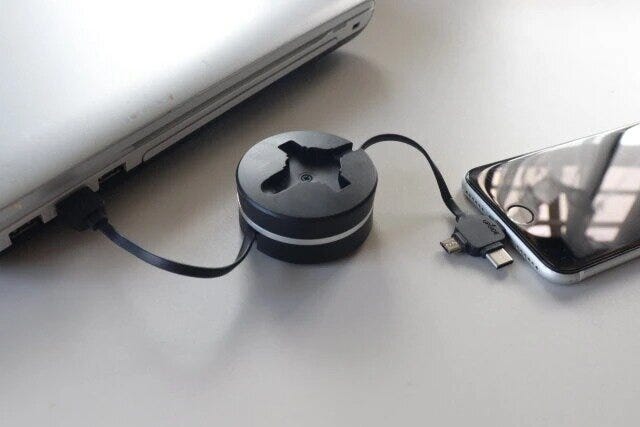1個で3役こなす『3in1リール式ケーブル』。microB・Type-C・for iPhone(Lightning)の3種類のアダプタと、USB Aが本体についている優れものです。