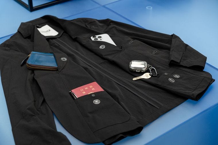 「着るバッグ」をテーマにしたアパレルの品揃えも充実する。合繊のテーラードジャケットは、裏側にスマートフォンや鍵など、生活必需品にサイズを合わせたポケットが複数付いている。セットアップでの着用も可能だ。