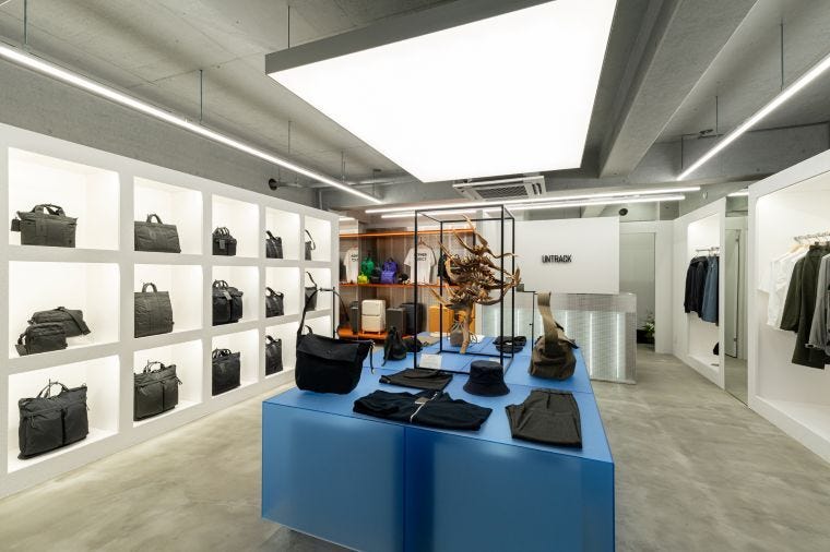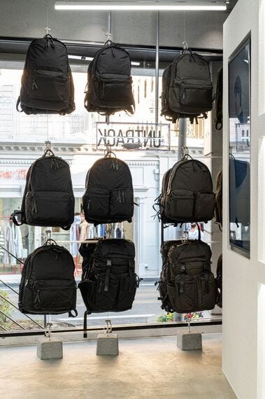直営店の面積は約165平方メートル。コンクリートの内装で、ブランドが見せたい都会的なイメージを表現した。一番人気のリュック「シティ」シリーズを中心にフルラインナップで揃える。