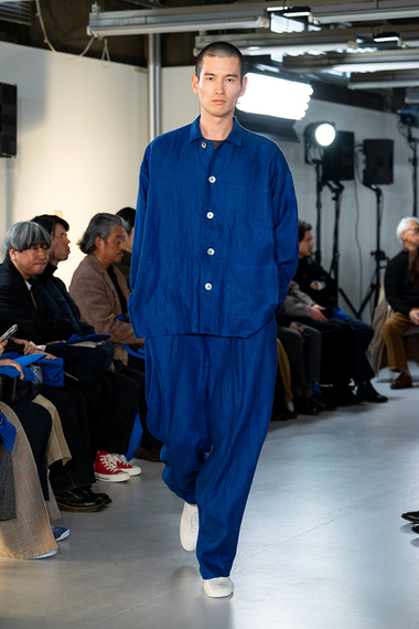 ファーストルックの上下はジャカード機で編んだジャージーで、編み目は細かなツイルのように見える。和歌山の丸編み産地のブランドも手掛ける馬場は、編みの心地良さと布帛のようなフォルムを「ボーダーレスに、どっちなのかわからないように」作ったと話す。一方で、織物であるリネンツイルには季節を感じるようなジャケットもある。