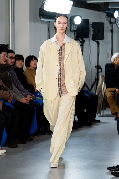 ファーストルックは、とても薄くて軽そうなテーラードタイプのジャケットとワイドパンツのセットアップ。続いて白シャツや大きなパッチポケットのジャケットにタックパンツのスタイル。体を楽に動かせるオーバーサイズで、生地の落ち感が作る柔らかなシルエットはユニセックスのイメージだ。