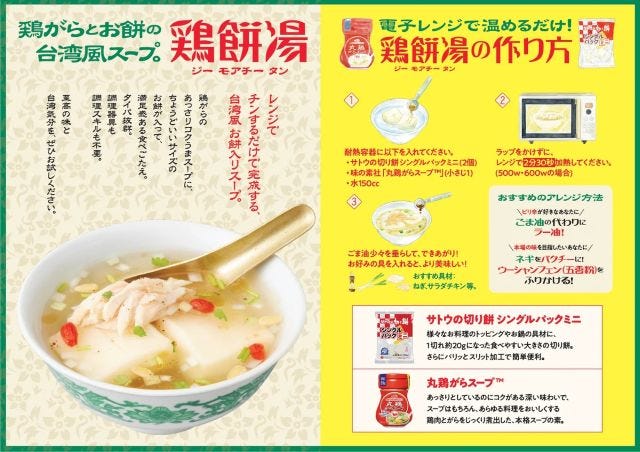 レンジで簡単調理の台湾風餅入りスープ「鶏餅湯」 サトウ食品×味の素コラボ企画「鶏餅湯3分食堂」が梅田で開催レンジで簡単調理の台湾風餅入りスープ「鶏餅湯」