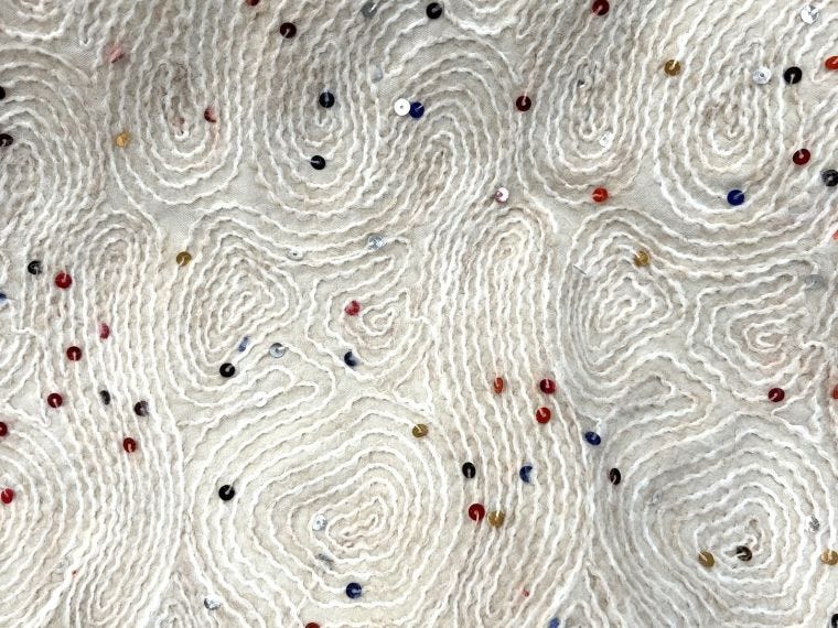 若者に焦点を当てたウェルビーイングもテーマの一つ。居心地の良いくつろげる場所をモチーフにしたレースはシンプルさの中に繊細な模様を描き、ふくらみのある糸で安心感を演出する。