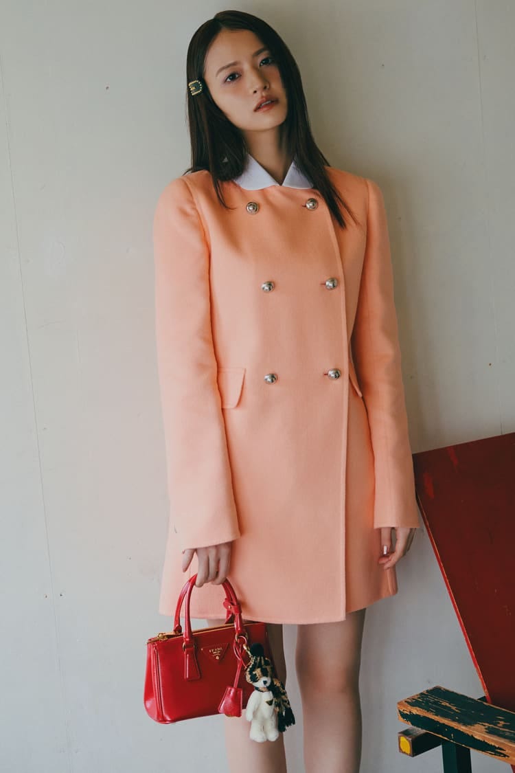 1枚で甘さもエレガントさも手に入る、ピンクのコートが心強い。レディな赤のバッグは、コンパクトなサイズで女性らしさが加速。