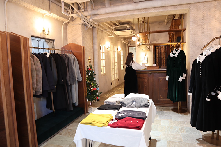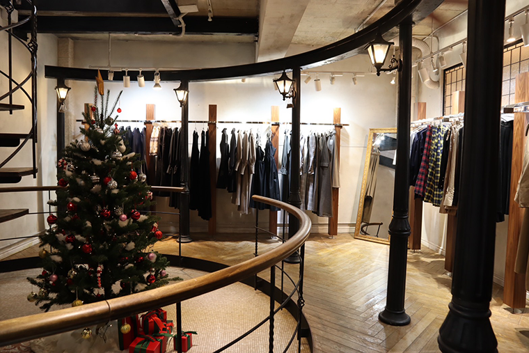 新店はアパレルのショールームなどとして使われていた建物。地上1階と地下1階の2層で、店舗面積は約130平方メートル。1階は新作を中心に揃え、試着室を二つ設けた。らせん階段を降りた先の地下は、定番商品のショールーム兼アイテムのストックルームとして活用する。ブランドの特性を踏まえ、ハンガーラックはオリジナルで製作した。シャンデリアなど従来の内装も生かしつつ、クラシカルな世界を表現した。