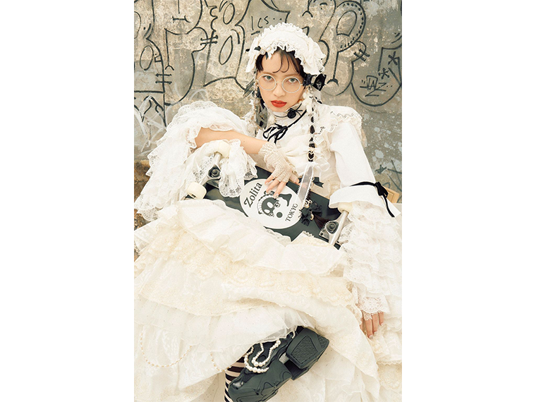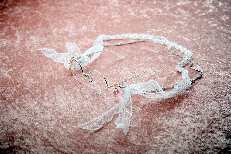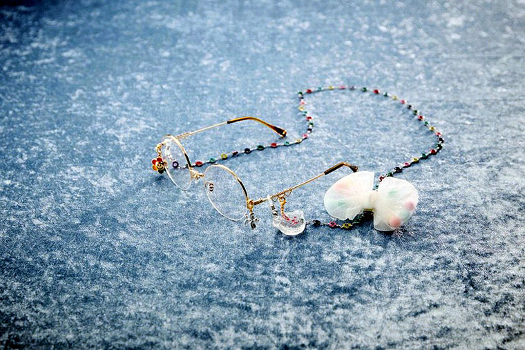 好みの眼鏡に、レースのリボンやビーズのチェーンのチャームを組み合わせ、ロリータ風スタイルとして提案。竹下通りというカルチャーの発信地から、国内外の客を対象に、ロリータファッションの新たな一面を広げていく。