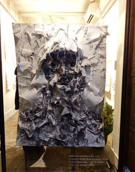 山縣良和が主宰する「リトゥンアフターワーズ」は、新たなプロジェクト「Where the Story Ends」を始めた。衣服を元に作り上げた平面作品で、12月7日まで東京・銀座1丁目の森岡書店で20点を展示している。
