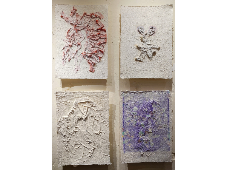 「これまで装いの物語を作って創作を続けてきたが、今の世の中はいろんな物語が氾濫(はんらん)しすぎていて、自分は何ができるのだろうかと無力感に陥った。そこで〝服の終わり〟をテーマに取り組んだ」と山縣は話す。和紙のようなキャンバスの作品は、白い服を粉砕した原料を使い、山梨県身延町の手すき和紙の工場ですいて制作した。過去のプロダクトの一部やトワル、ぬいぐるみ、子供服など身近なものを包み込むように繊維を幾層にも重ねている。