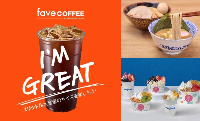 韓国発の人気コーヒーブランド「fave COFFEE」が日本初上陸! 50種類以上のドリンクがお手頃価格で展開される韓国の人気ショップで、看板メニューの1L「グレートアメリカーノ」をはじめとした良質なコーヒーを使用したメニューが自慢です。