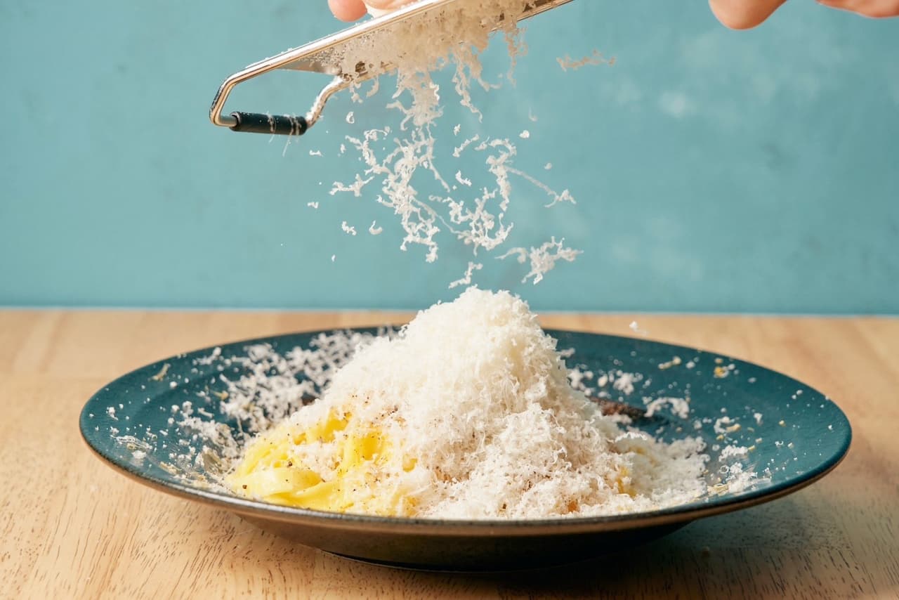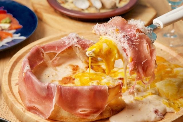 「チーズ!チーズ!チーズ!カルボナーラ!」(1,628円) 系列店の肉屋直送の食材を使った「チーズプラス厳選の赤身ステーキ」、パルメザン・レッドチェダー・グラナパダーノの3種類のチーズをトッピングした「チーズ!チーズ!チーズ!カルボナーラ!」など、約60種類のメニューがスタンバイ。フォカッチャのお通しが“550円で食べ放題”なのもうれしいポイントです。