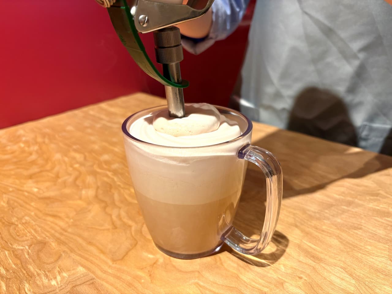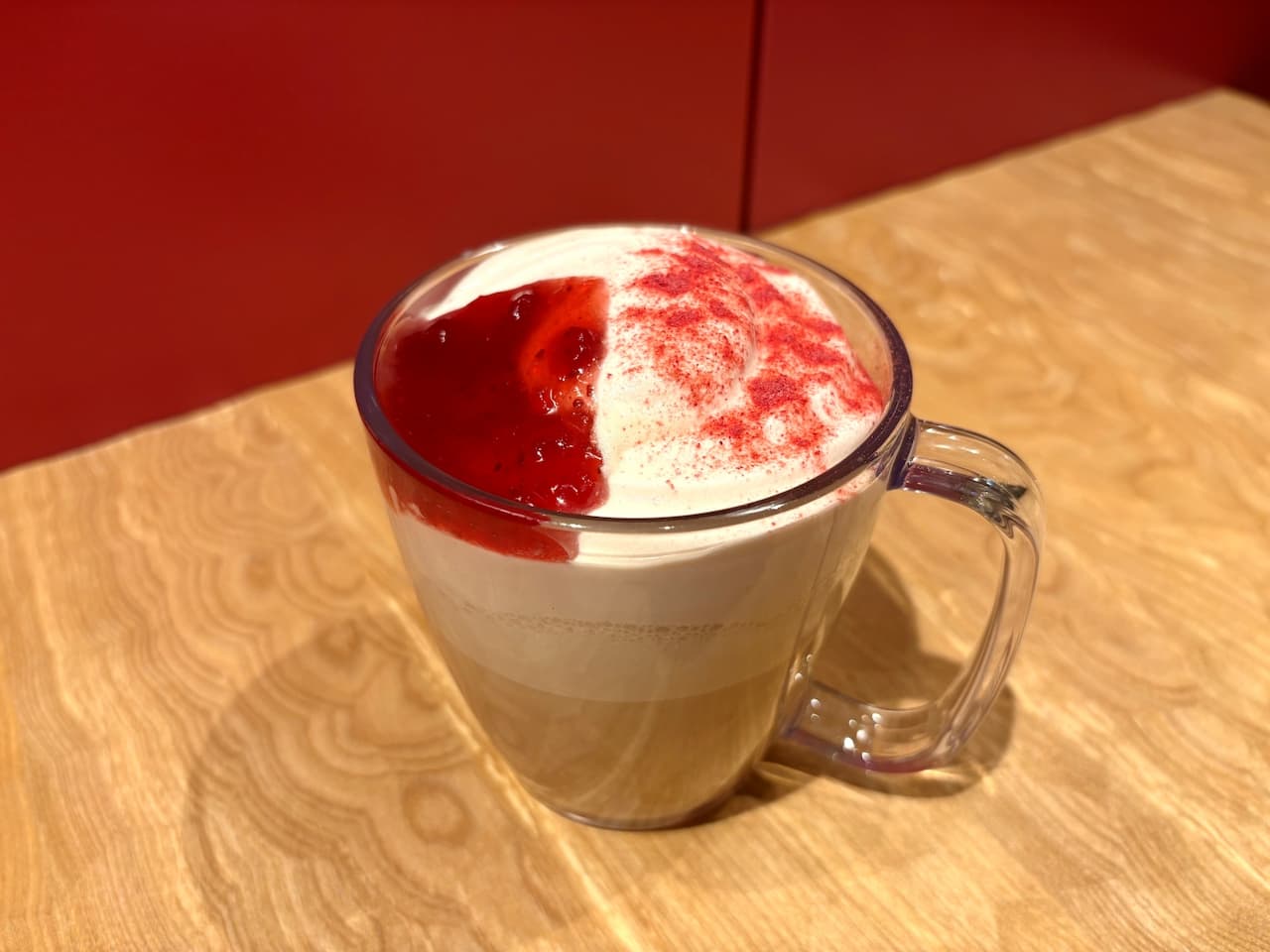 ティーラテにもティームースがたっぷり! ホットを注文すると、ティーベースの上にティームースとラズベリー果肉ソースが重なり、やわらかな甘さの中にラズベリーパウダーの甘酸っぱさがきゅんと際立つバランスに。アイスも同じ構成で、クリアカップに映える層がとても美しいので、イートインでの注文もおすすめです。