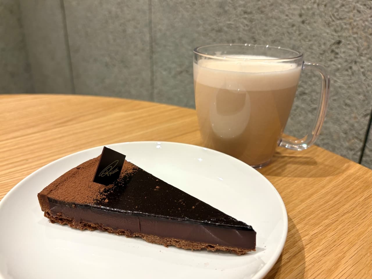 手前から、「プリンチーナ」(テイクアウト/864円、イートイン/880円)、「アールグレイ ブーケ ディライト ティー ラテ」 こちらはイタリア産チョコレートを使用したガナッシュをカカオタルトに流し込み、チョコレートソースとココアパウダーで仕上げた冬らしいケーキ「プリンチーナ」。華やかな香りの「アールグレイ ブーケ ディライト ティー ラテ」と合わせると、カカオの味わいがより贅沢に。