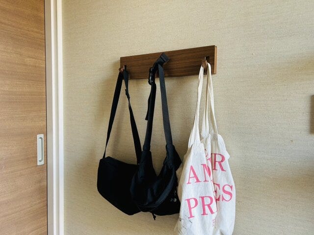 よく使うモノは、使う場所のすぐ近くに配置することで、出し入れの動作がスムーズになり、片づけのストレスが軽減します。上の写真のように我が家では玄関に外出時に使う子どものバッグやエコバックを置いています。