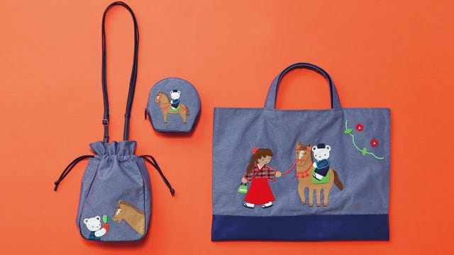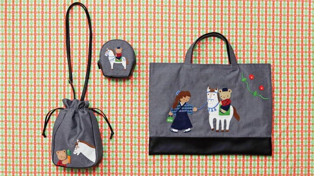 「デニムバッグ」と「ポーチ」は、日本の伝統的な武術”やぶさめ”からインスピレーションを受けたアートで演出。馬具を身に着けた馬に乗るクマちゃんと手綱を持った女の子が和装で表現されています。さらに、女の子とクマちゃんの服にファミリアオリジナルチェック柄を使用しているのもこだわりのポイントです。