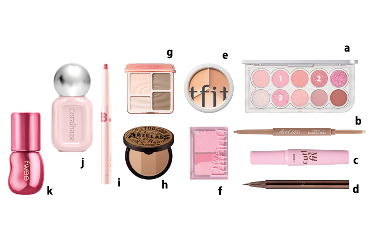 で目尻の三角ゾーンを平行に埋めてタレ目見せ。b