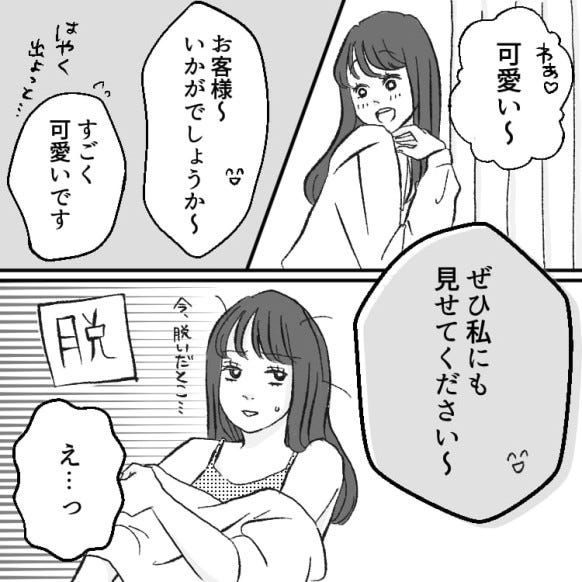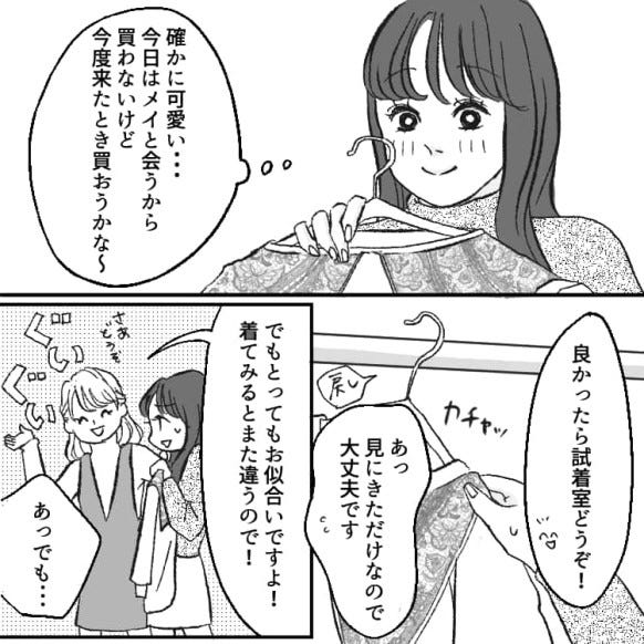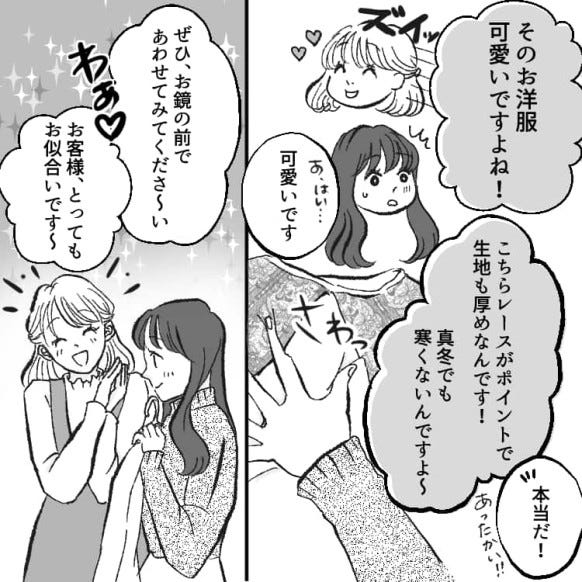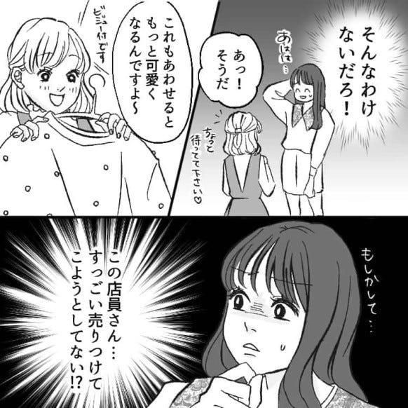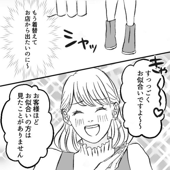 すると店員さんは強引な試着や、ベタ褒め、ついにはおすすめ商品まで売りつけてきました。