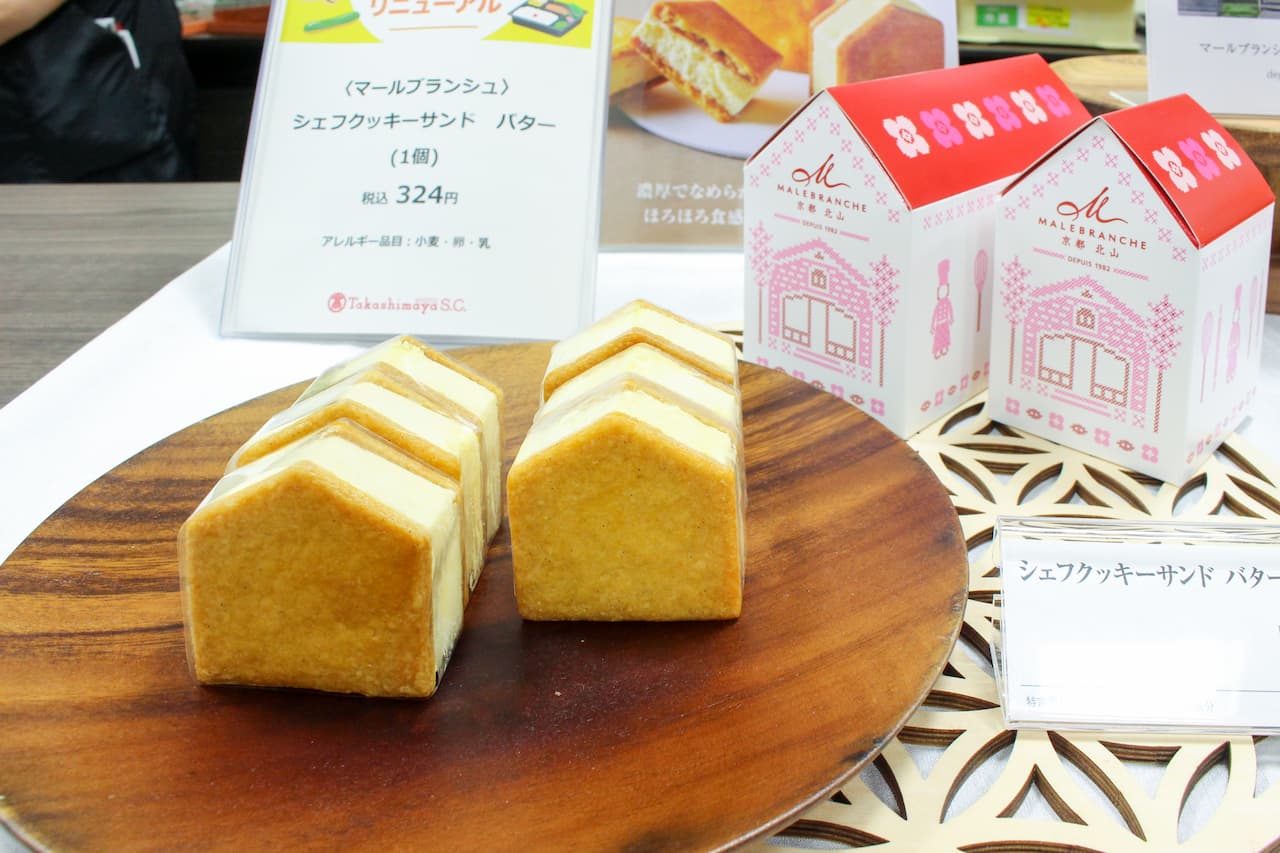 「シェフクッキーサンド バター」324円 京都・北山に本店を構える「マールブランシュ」では、新作の「シェフクッキーサンド」に注目。発酵バターの深いコクと香りが広がるバタークリームを、ほろほろ食感のクッキーでサンドした、見た目にもかわいい一品です。