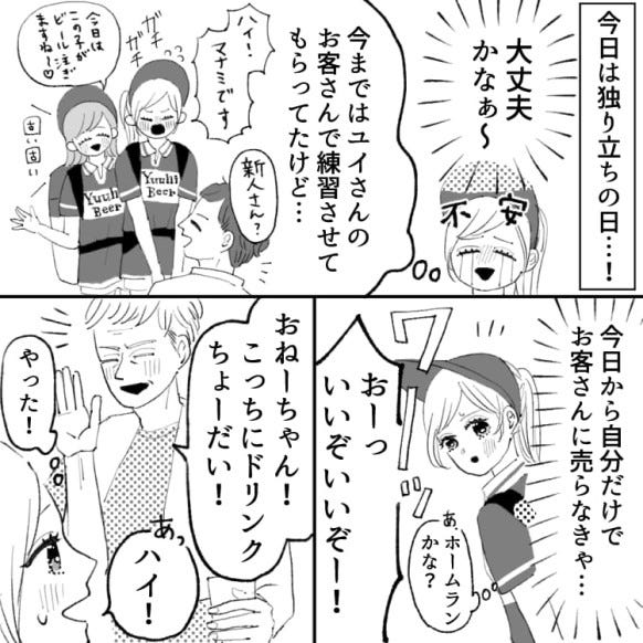 始めたばかりで慣れない主人公に、売上もよく球場のアイドル的存在のユイ先輩が、やさしく指導をしてくれています。