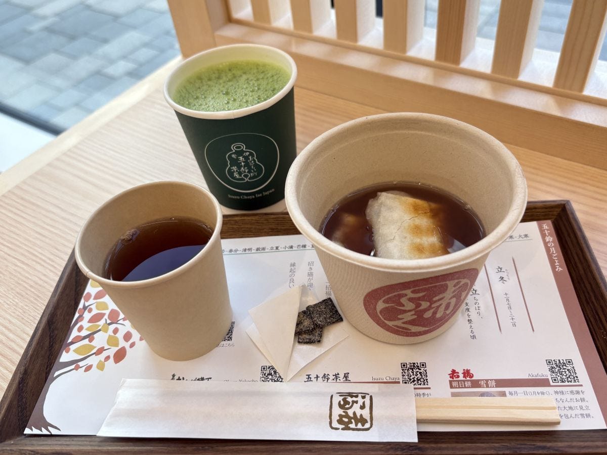 寒い季節に恋しくなる「赤福ぜんざい」は、絶対に味わっておきたい一杯。お餅は注文が入ってから焼き上げるスタイルで、香ばしさとやわらかさのコントラストが絶妙。ほうじ茶と塩昆布が添えられ、ほっとひと息つきたい時間にぴったりです。