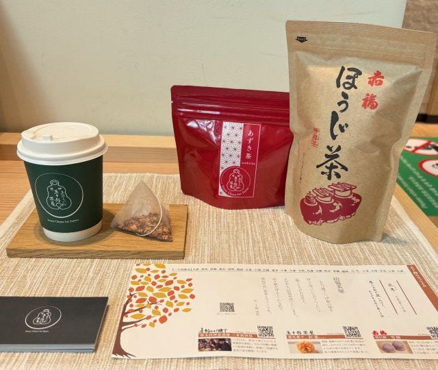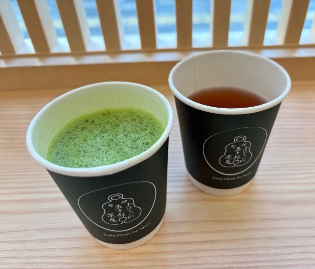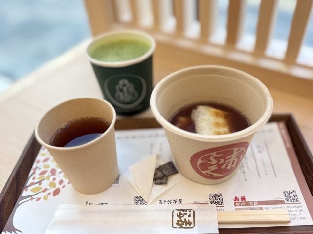 左から「抹茶ラテ」650円、「あずき茶」500円 ドリンクは単品注文もOK。「あずき茶」は、北海道産あずきを香ばしく焙煎し、やさしい味わいを楽しめるノンカフェインのドリンク。「抹茶ラテ」は、赤福店舗で提供している抹茶を使用し、程よい甘みと抹茶の旨み感じる一杯。