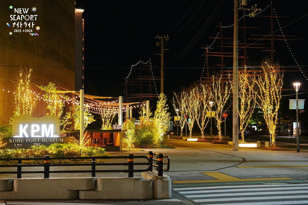 ニューシーポート(新港町周辺)をシャンパンゴールドの光で彩る冬の大型イルミネーションイベントです。2024年開催時よりも範囲を拡大した街路樹イルミネーションに加え、「神戸ポートミュージアム」周辺には高さ約8mの巨大ツリーが登場。