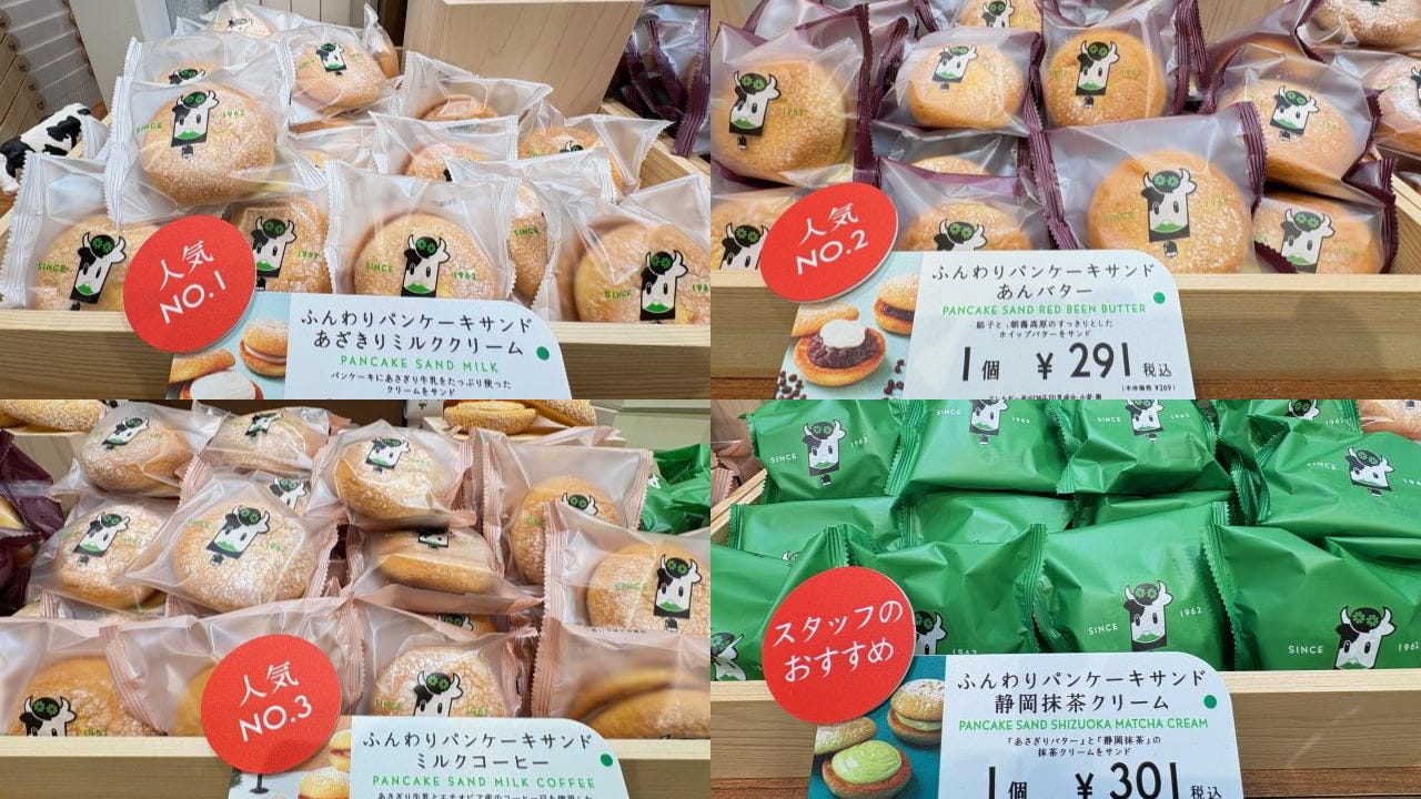 左上から時計回りに:「ふんわりパンケーキサンド あさぎりミルククリーム」1個261円、「ふんわりパンケーキサンド あんバター」1個291円、「ふんわりパンケーキサンド ミルクコーヒー」1個291円、「ふんわりパンケーキサンド 静岡抹茶クリーム」1個301円 ※季節ごとに展開フレーバーが変わります 中央の棚には、人気の 「ふんわりパンケーキサンド」 がずらり。あさぎりミルククリーム・いちごクリーム・あんバター・静岡抹茶クリーム・ミルクコーヒー・モンブラン・キャラメルの7種類があり、選ぶのに迷いそう! 3個入りのセットもあり、手土産や差し入れにも使いやすいのが魅力です。