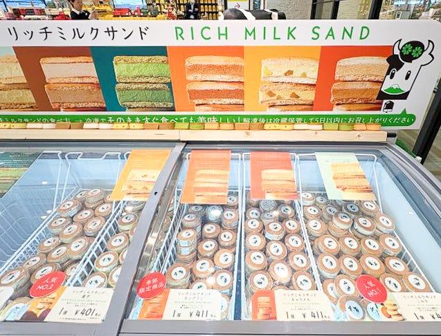 「リッチミルクサンド」※季節ごとに展開フレーバーが変わります 冷凍コーナーには、濃厚ミルクをサブレで包んだ 「リッチミルクサンド」 シリーズも。寒い季節に、あたたかい部屋でひんやりスイーツを楽しむのもおすすめです。