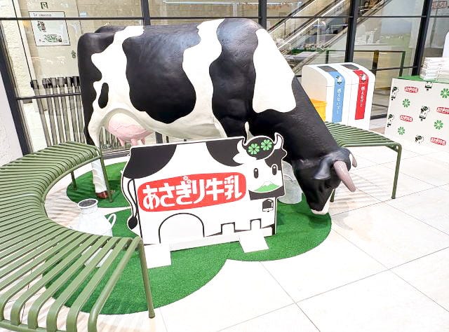 大きな牛のフィギュアがお出迎えしてくれる「あさぎり牛乳」。イートイン用のベンチが設置され、買い物途中の気軽なひと休みにぴったりの空間です。