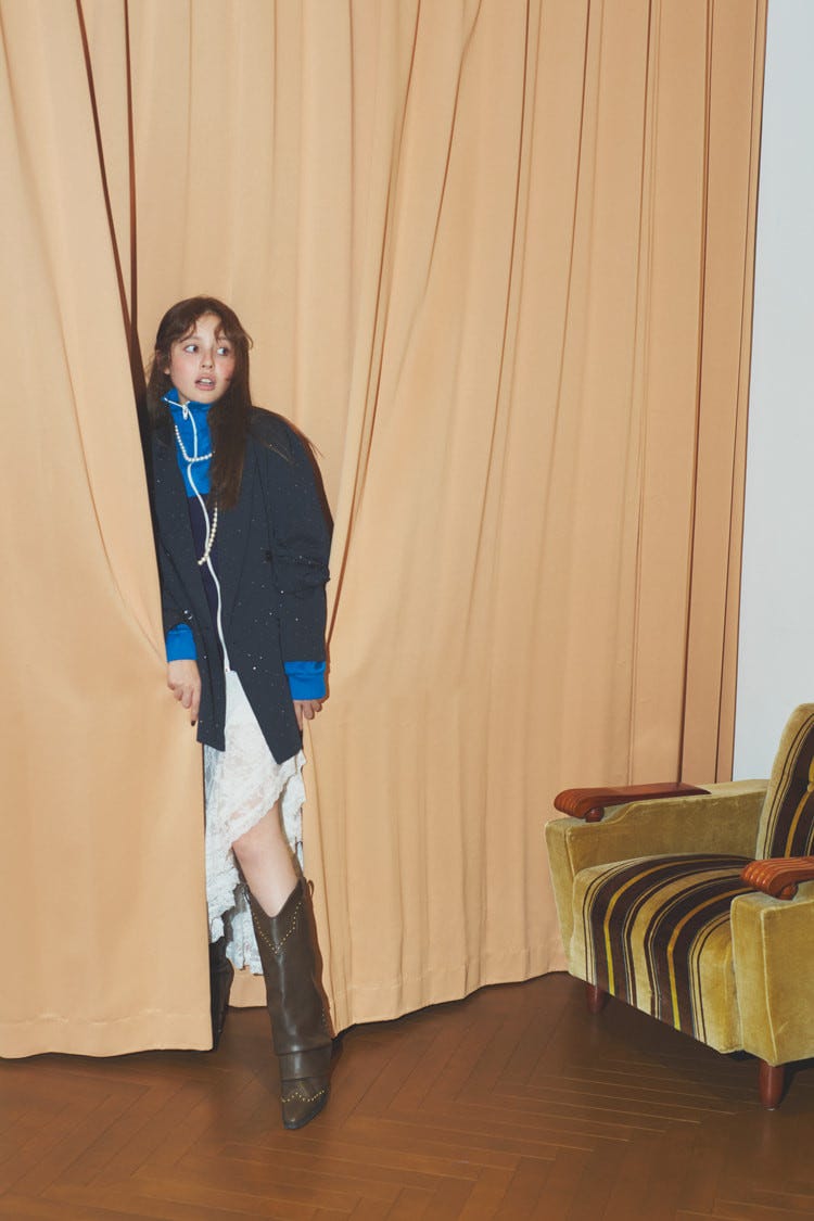 ビジューつきジャケット 15,600円/Olu. ジャージブルゾン 4,290円/Little Trip to Heaven レーススカート 1,599円、ウエスタンブーツ 3,899円/ともにGRL パールネックレス 25,300円、ロングパールネックレス 14,040円/ともにアビステ