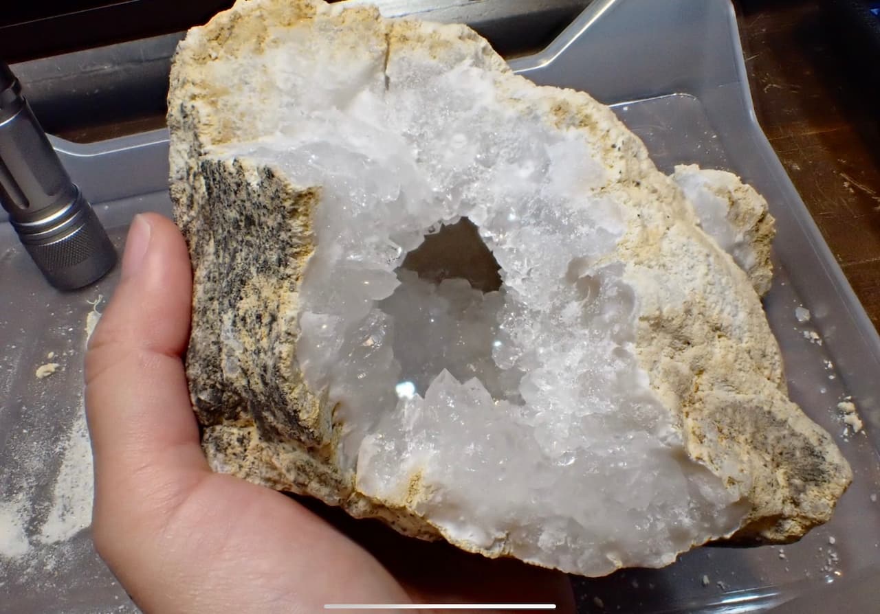 岩の中に眠る結晶をハンマーで割って見る体験コーナー