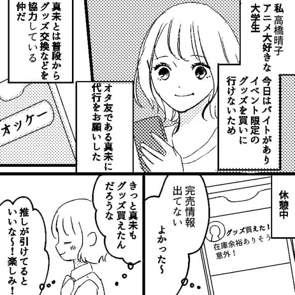 主人公はイベント限定のグッズが欲しかったのですが、生憎その日はバイトで行けないため、友だちの真未に代行をお願いしました。