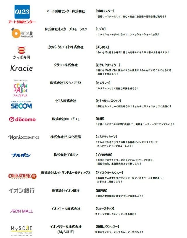 出展企業および、アクティビティ名称(一部、敬称略) 「モデル」「すし職人」「銀行員」「おかしクリエイター」「アイスクリームクルー」「引越マスター」など、30種類以上の仕事にチャレンジしながら、楽しみ・学び・成長する体験を。