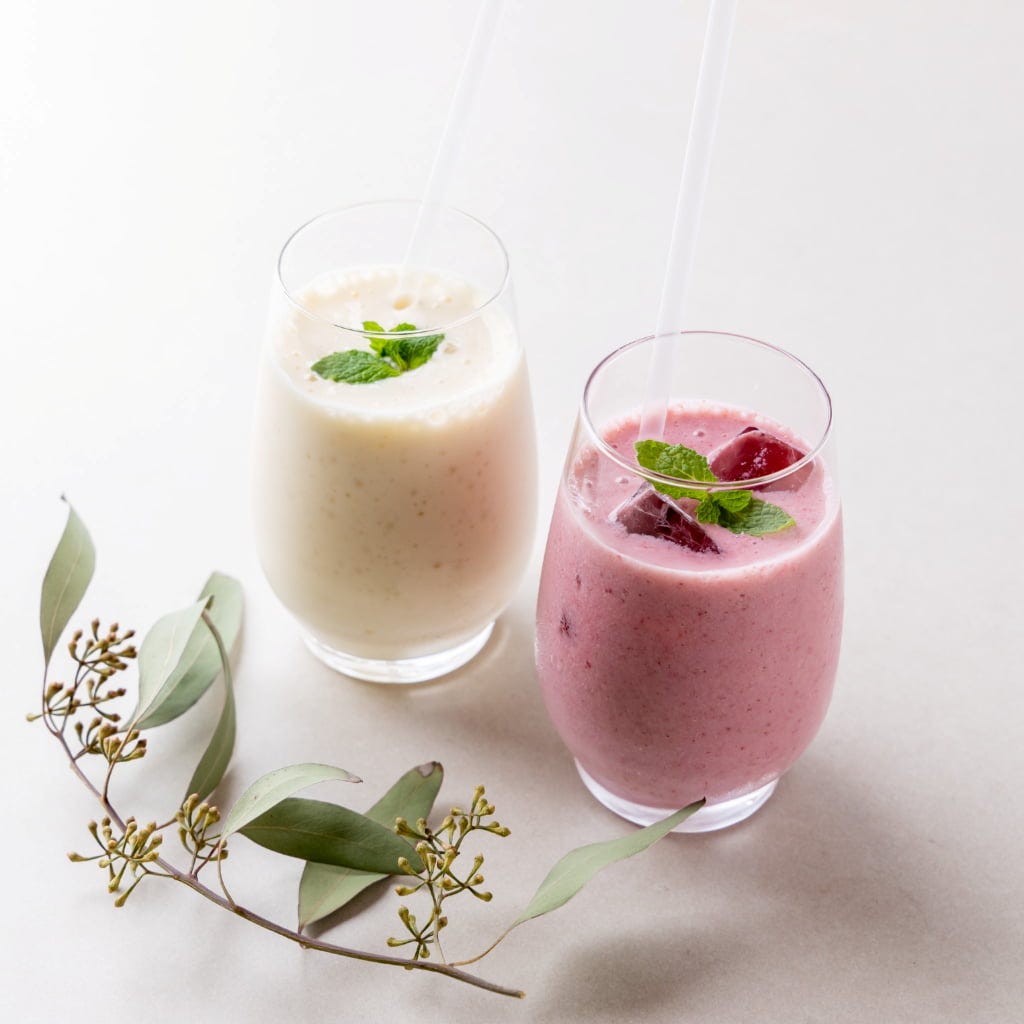 「バナナスムージー」と「いちごスムージー」 カフェでは、地元食材を活かした料理やアフタヌーンティー、6種類の焼きたて生スコーンなど、こだわりのメニューがそろいます。