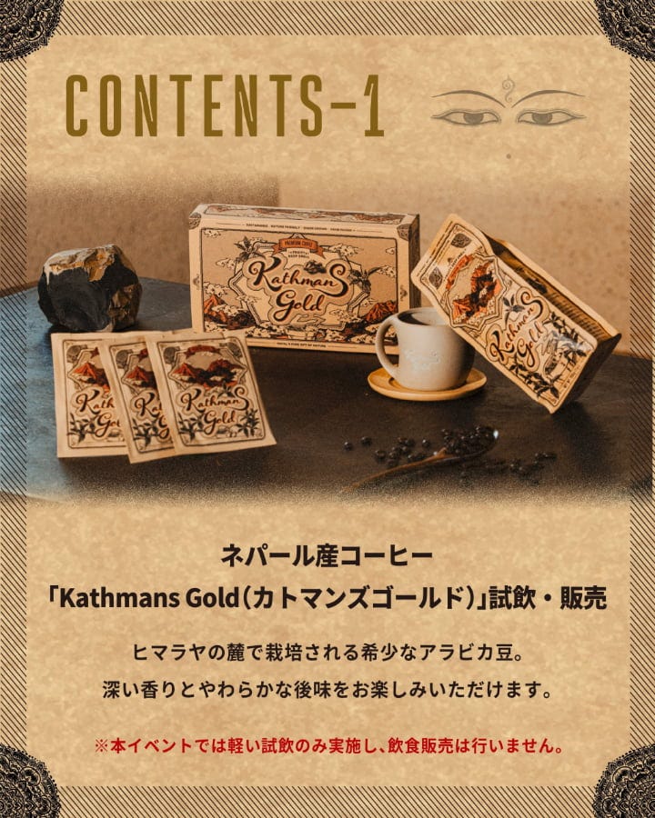 今回のイベントでは、ネパールパビリオンで特に注目を集めたネパール産コーヒー「Kathmans Gold(カトマンズゴールド)」が再登場! ネパールで栽培される貴重な豆を使用した深みのある香りとやわらかな後味が特長です。“ネパールの本物の味” を日本で体験できるチャンスですよ。
