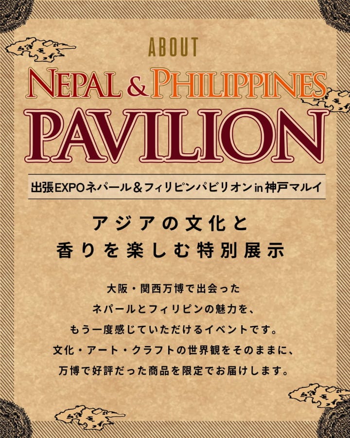 今回「神戸マルイ」で開催されるのは、大阪・関西万博の「ネパールパビリオン」「フィリピンパビリオン」で好評だった商品やスタンプ、文化体験がもう一度味わえる特別ポップアップイベント。“万博の余韻をもう一度” をテーマに、文化・香り・アートを身近に感じられる空間となっています。