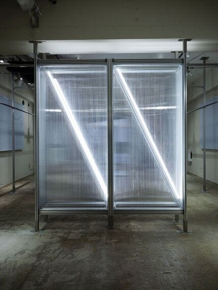 内装はビンテージ・インテリアショップ「ユーアーウェルカム」を営む矢口周太郎氏が担当。無機質な要素をベースにしながら、照明、インテリア、質感のバランスでエッジを利かせた空間に仕上げた。店内中央に配されたシンボリックな照明・棚は、ニューポリシーの象徴となる存在。ブランドの解釈とインテリアデザインが融合した、新しい価値観を刺激する空間となる。