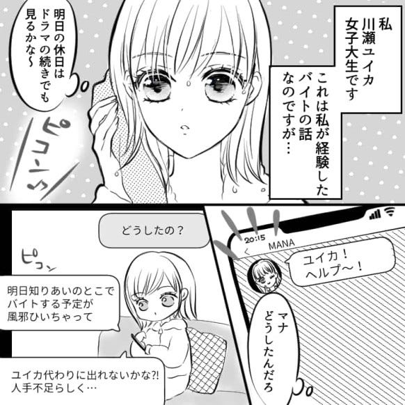 主人公はある日友だちのマナに、自分の代理でバイトをしてくれないかと頼まれます。