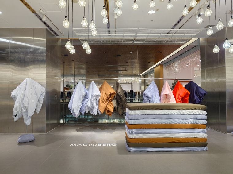 作り手のストーリーを体感できるコンテンツが消費のカギに――エストネーションが六本木ヒルズ店で今月開催している、スウェーデン発のホームウェア「マグニバーグ」の期間限定店が好評だ。12月上旬に本国のクリエイティブチームが来日、ベッドリネンをアートのように展示したり、壁面に写真をコラージュしたりと、臨場感のあるインスタレーションが来店客に響いている。