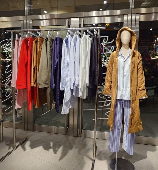 「商品そのもののMDだけではなく、ブランドの背景やイメージを同時に伝えていく売り場のモチベーションに力を入れている」と話すのは、ウィメンズのチーフディレクターの藤井かんなさん。マグニバーグは26年4月から常設で扱う予定だが、その前に期間限定店を企画。クリエイティブチームには、スペースを最大限に活用した空間演出を考えてもらった。コットンサテンのパジャマ、バスローブ、タオル、マフラー、ベッドリネンなどシンプルなアイテムだが、色使いやテクスチャーに独自性のあるブランドの全体像が分かりやすい。色鮮やかなチェックのマフラー(3万円台)は早期に売れたという。