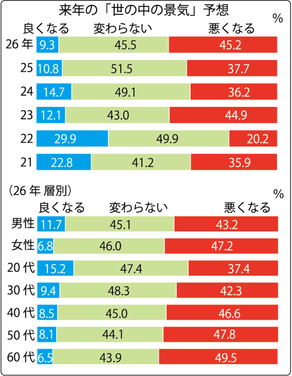 博報堂生活総合研究所が生活者に聞いた「2026年生活気分」によると、来年の景気予測は「悪くなる」が45.2%で前回比7.5ポイント悪化し、15年の調査開始以来の最大値となった。また、「良くなる」が9.3%で1.5ポイント減、「変わらない」が45.5%で6.0ポイント減だった。「悪くなる」と回答した人は、20代が37.4%に対し60代が49.5%で、年代が高くなるほど景況感が悪くなると感じている。