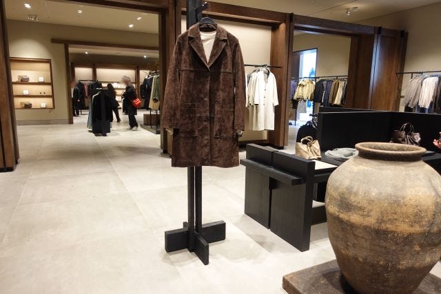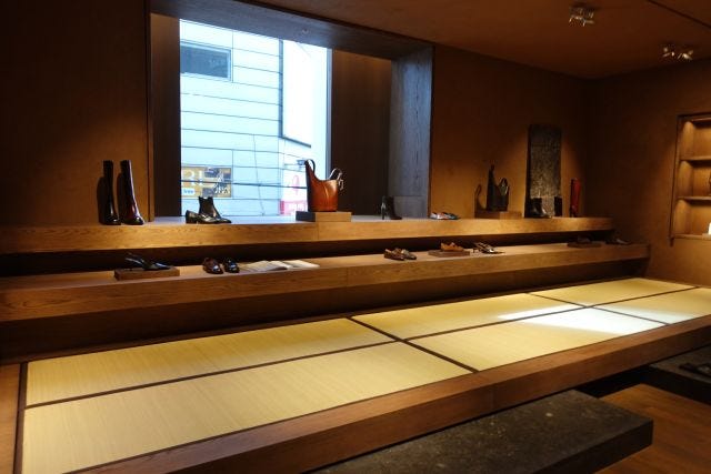 注目はシューズ&バッグの専門エリアです。日本の土間を再現した畳が広がる空間で、靴を脱いでゆったりとフィッティングが可能。リアルレザーを使ったロングブーツやビッグバッグなど、トレンド感たっぷりのアイテムがずらり。
