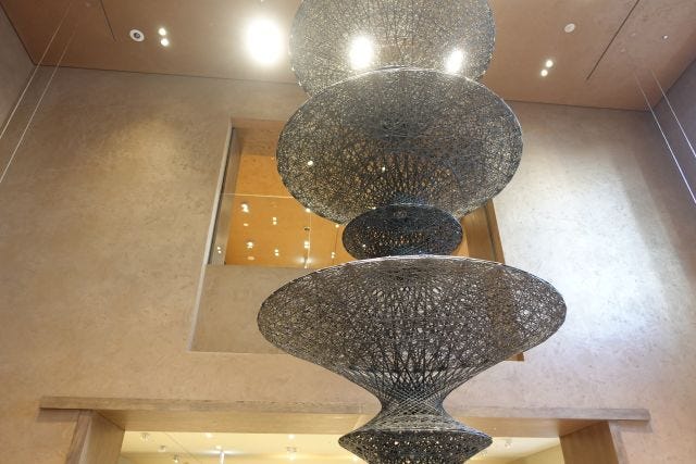 日本へのオマージュが込められた内装は、日本の伝統文化や建築を感じられる要素がそこかしこに散りばめられています。店舗の顔となるエントランスには、手仕事のぬくもりを感じられる土壁を採用。目を引く巨大なオブジェはカーボンファイバーを採用するなど、サステナブルへの取り組みにも力を入れています。