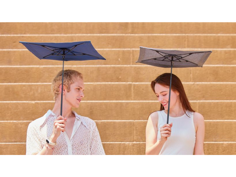 デザインは女性の丸い日傘に対して水平型の四角で45センチの小型サイズ。天然木のメープルを削り出した持ち手、生地は倉敷・児島の染色した綿でUV(紫外線)カット率99%、ストラップは組革ひもと自然素材を使用。意匠登録済み、実用新案取得済み、立体商標出願中だ。小型で水平のため、雑踏でもぶつからず視界も確保できる。コンパクトなデザインはファッションの一部としてコーディネートを意識したためだが、スタイリッシュでスマートな印象だけでなく、スマートフォンと同じ160グラムの軽さになり、持ち歩きやすさを実現した。税込み1万9800円。色は藍染め、黒染、茶、小紋柄、白木。