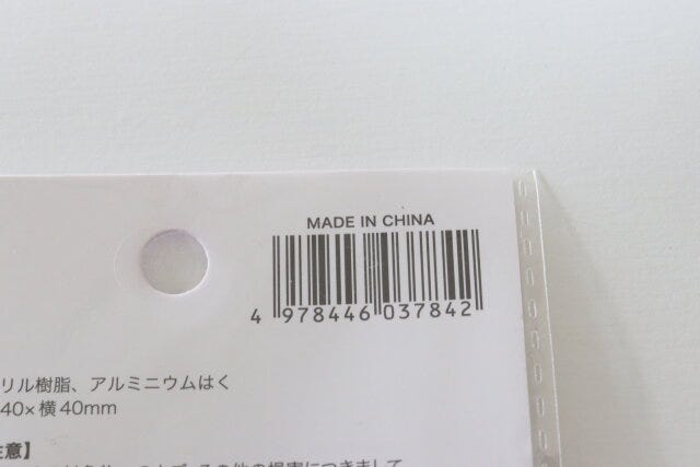 今回ご紹介するのは、その名も『貼ってはがせるミラーシート』。2枚入りでお値段は¥110(税込)とコスパ抜群。材質はアクリル樹脂とアルミニウム箔で、サイズは約縦40mm×横40mmです。