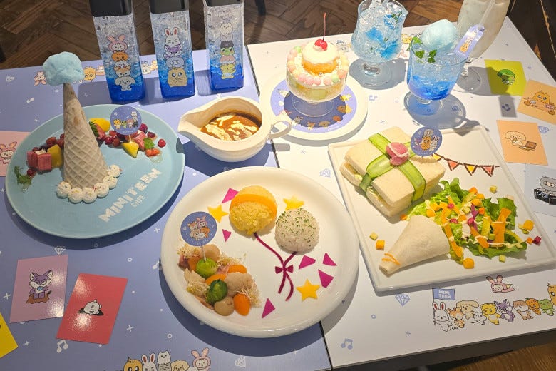 水色と白を基調とした机には、一列に並んだMINITEENが♡ カフェメニューと一緒に撮ったら