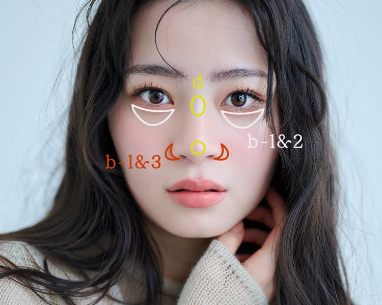 を鼻先と鼻根にのみ指でのせ、お肌にメリハリを与えて。