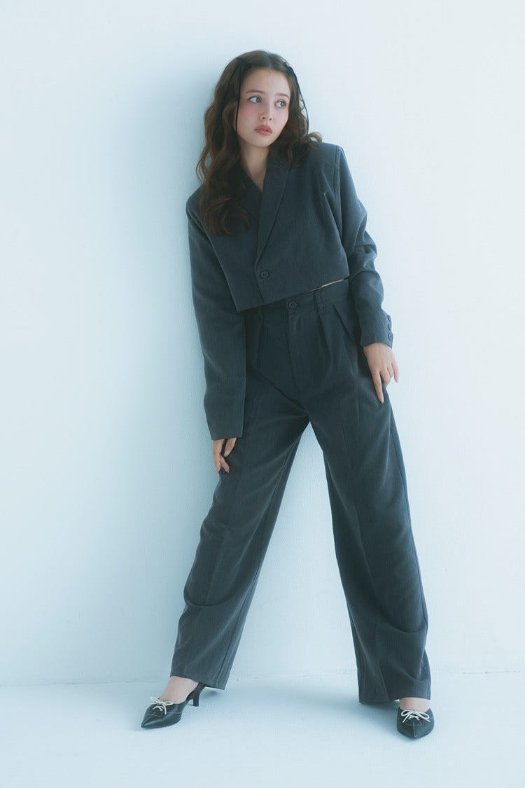 強気な印象になりすぎるのを防いでくれる、ショート丈のジャケット。ハイウエストかつ、タックの入ったパンツを選ぶことで、スタイルアップも叶えてくれる。