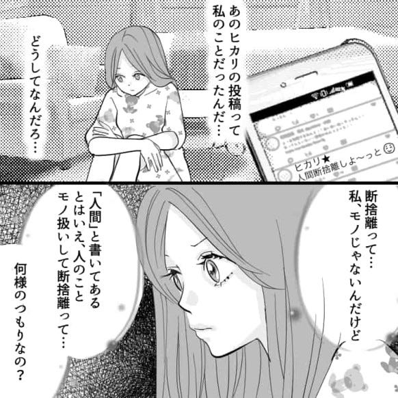 ある日ヒカリがSNSで「人間断捨離しよ〜っと」と投稿をし、その翌日から主人公はヒカリに無視をされるようになります。
