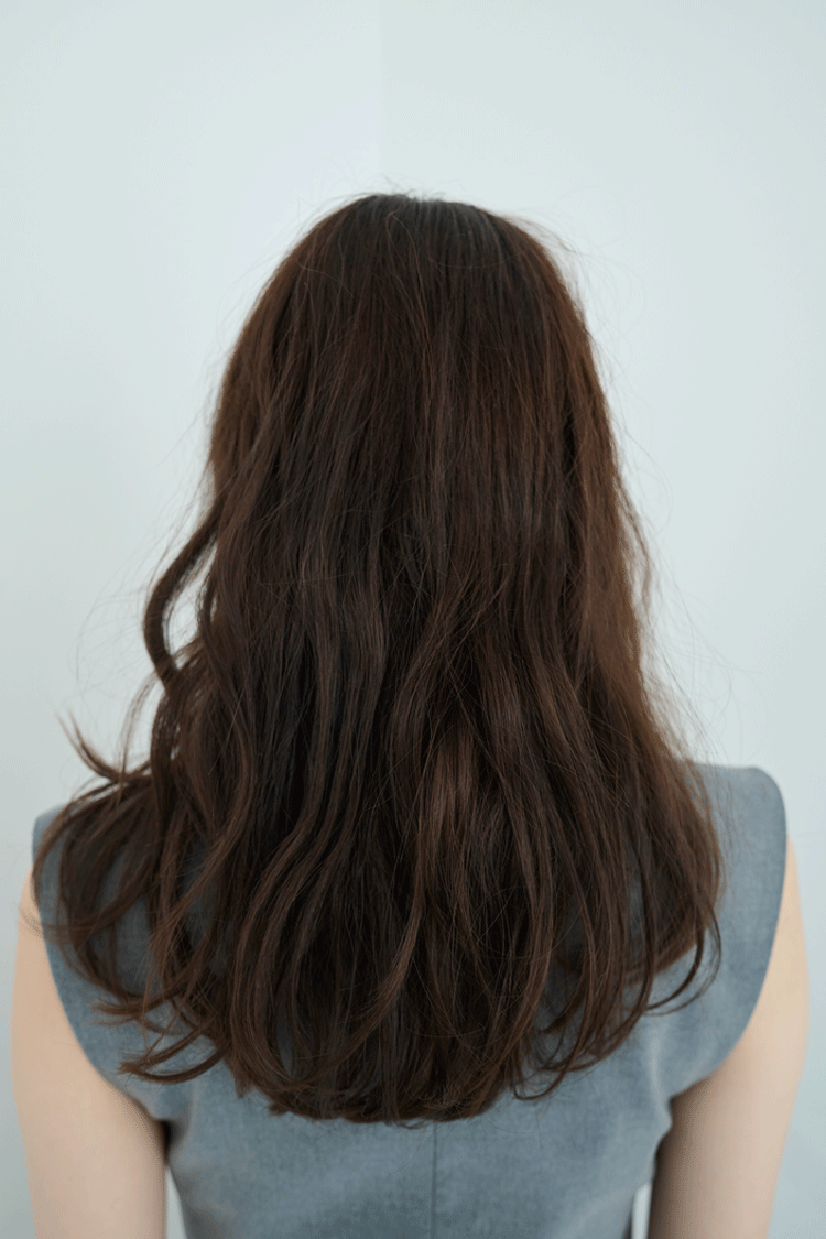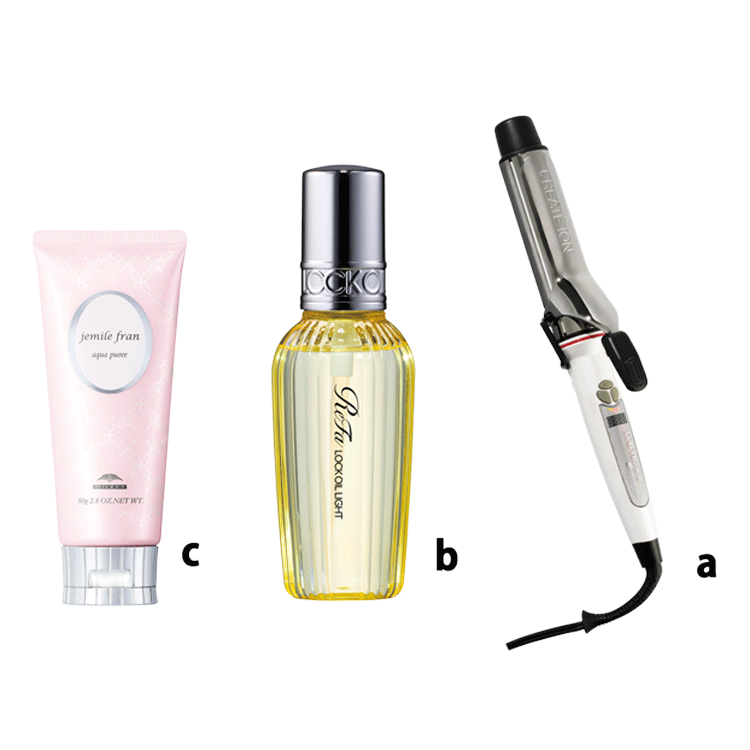 をワンプッシュし、髪にまんべんなく広げる。次に髪をすべて前に持ってきたら、a