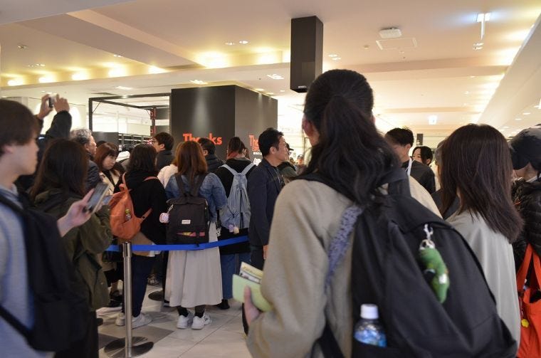 当初は「気味が悪い」などの声があったミャクミャクの人気も急上昇し、多彩なミャクミャクとの協業グッズを集積した会場内公式ストアは連日、入店待ちの長蛇の列ができた。会場外公式ストアの人気も高まった。ミャクミャク人気は衰えず、万博閉幕後の会場外ストアは、今でも目当ての商品を求める人でにぎわっている。